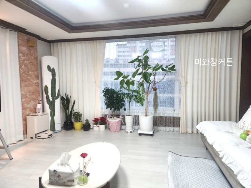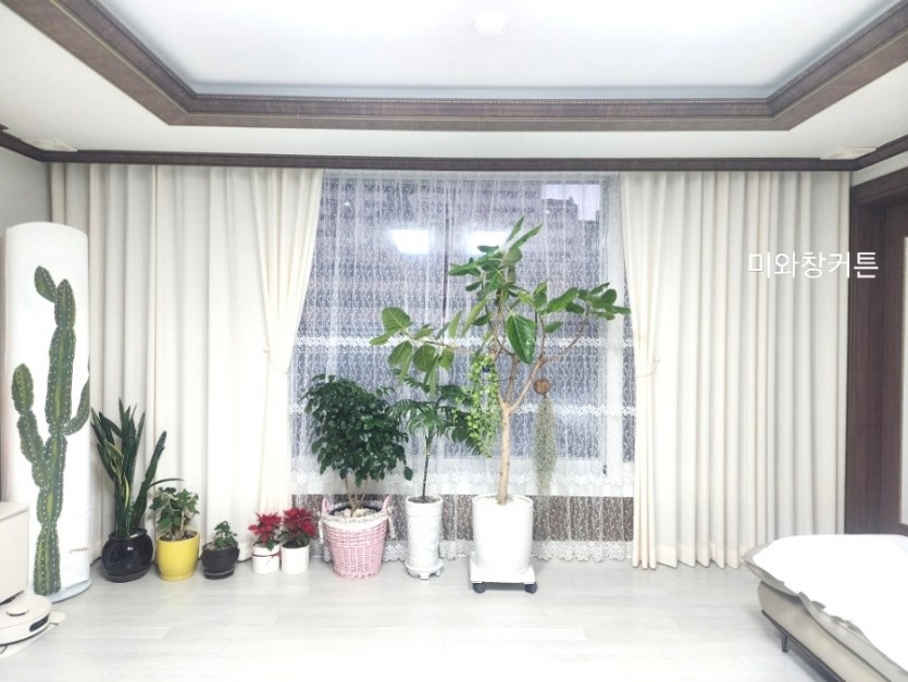 아파트 거실 아이보리 커튼 + 화이트 자수레이스 커튼 시공