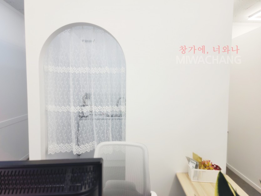 피부샾 아치형통로 자수레이스 커튼 시공