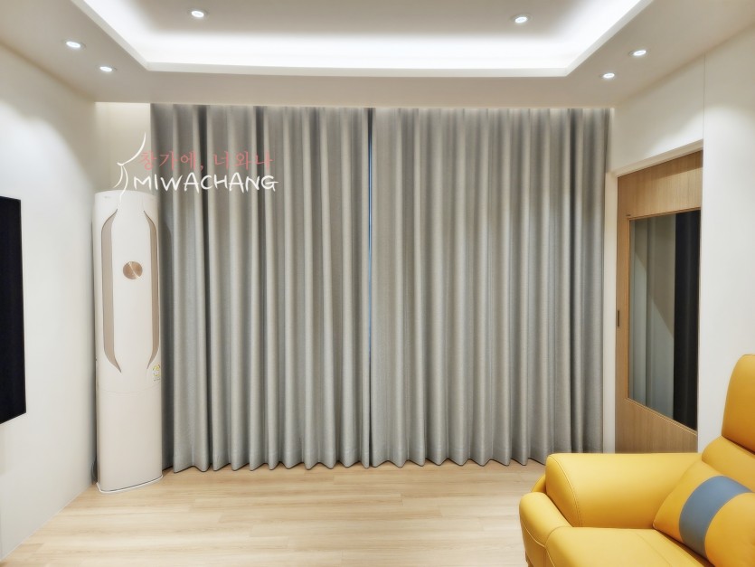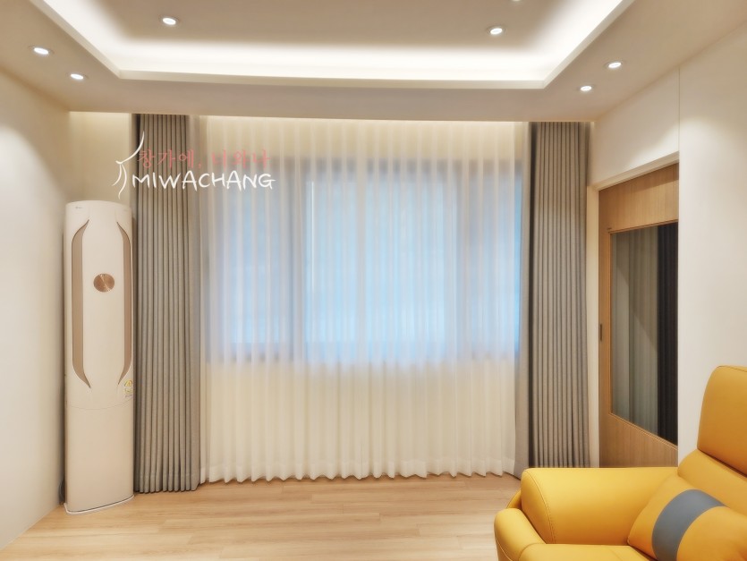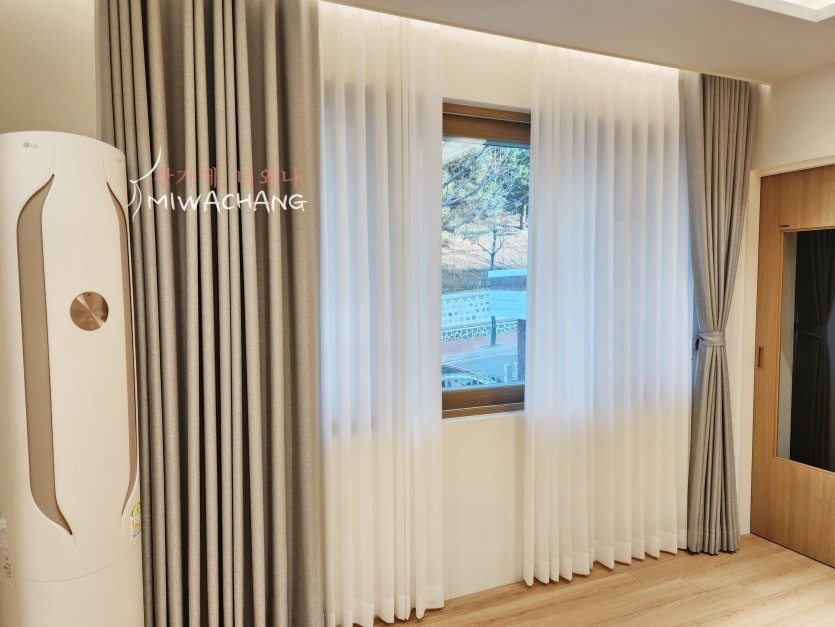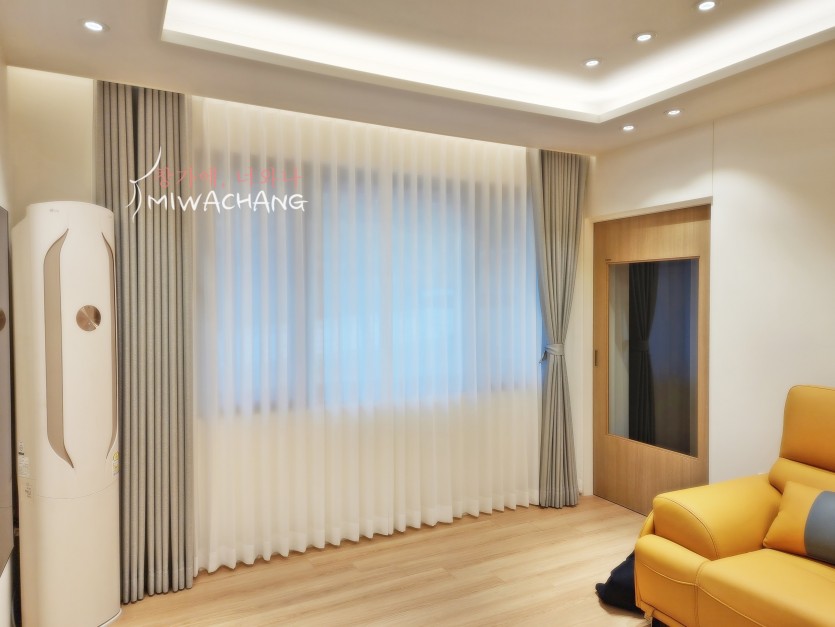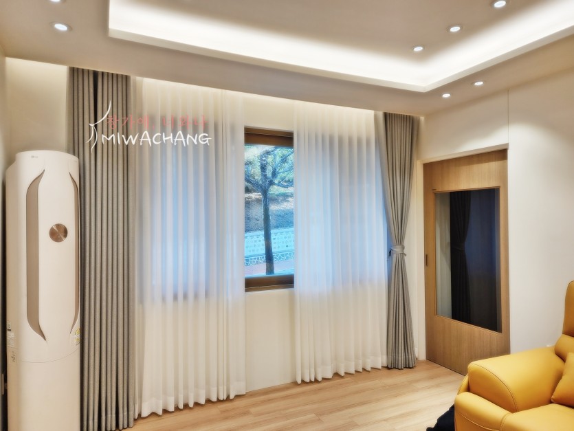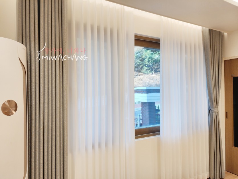 주택 거실 실버그레이 암막커튼 + 화이트 쉬폰커튼 시공