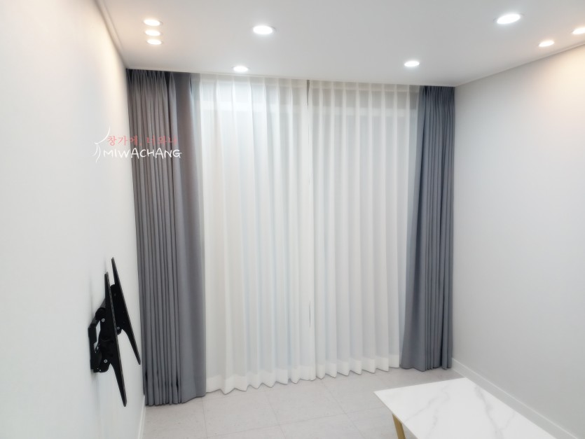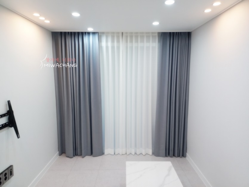 빌라 거실 블루그레이 암막커튼(펄) + 화이트 쉬폰커튼 시공
