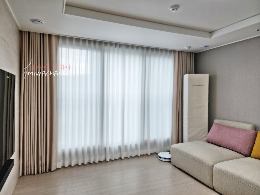 아파트 거실 내추럴베이지 무지커튼 + 화이트 쉬폰커튼 시공
