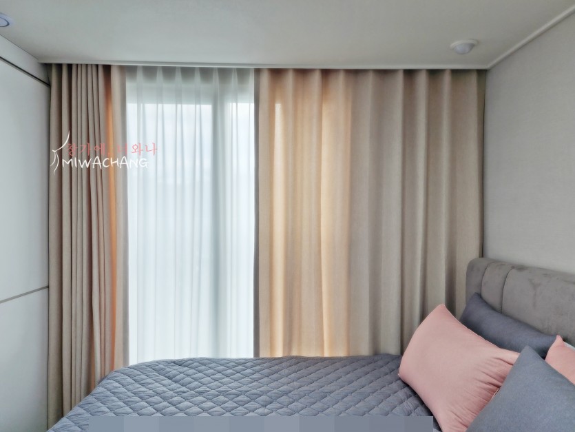 아파트 안방 내추럴베이지 무지커튼 + 화이트 쉬폰커튼 시공