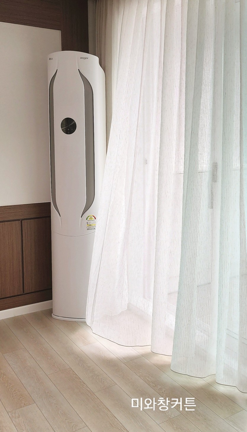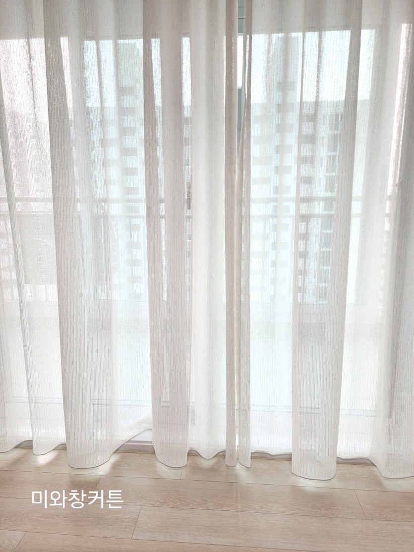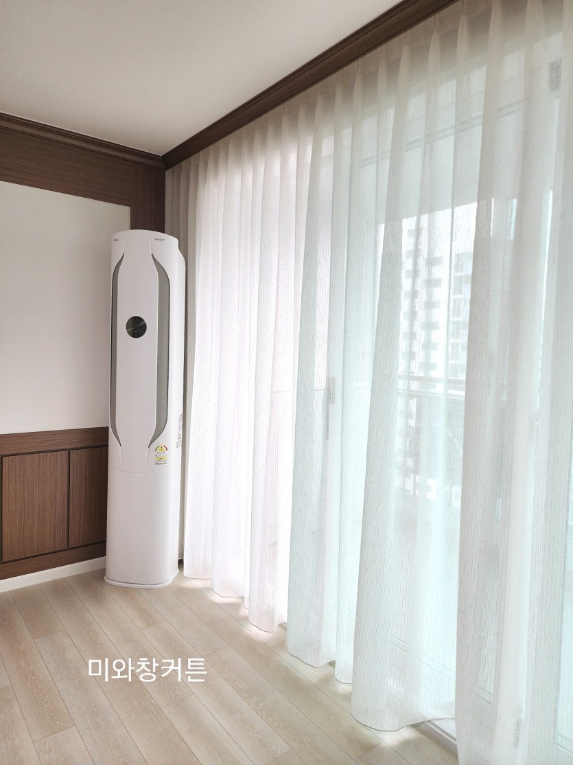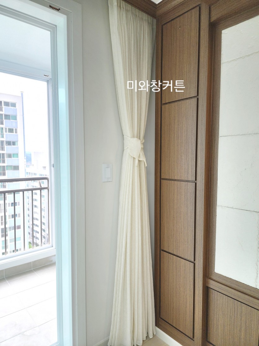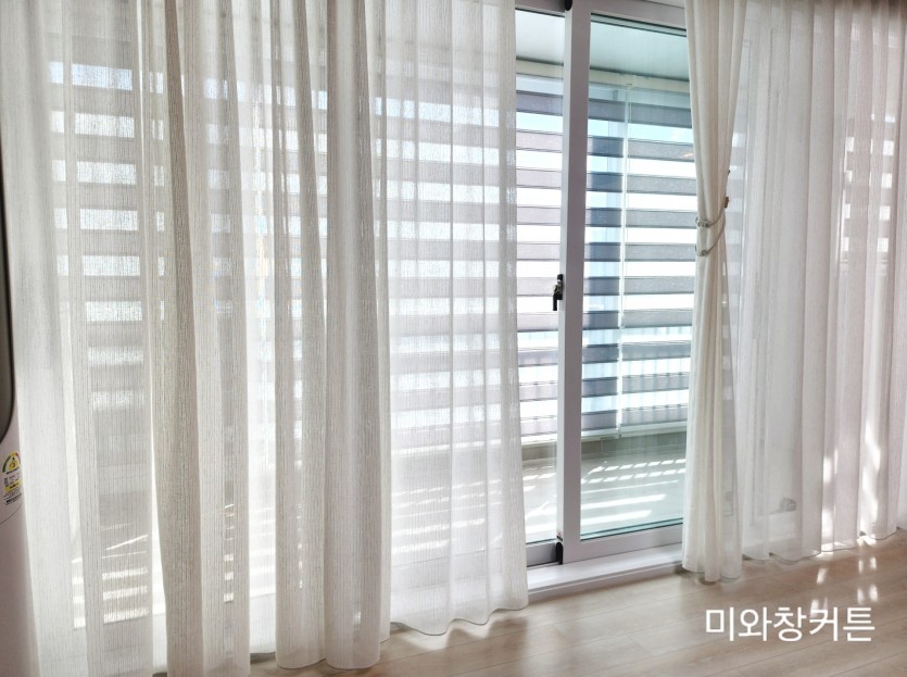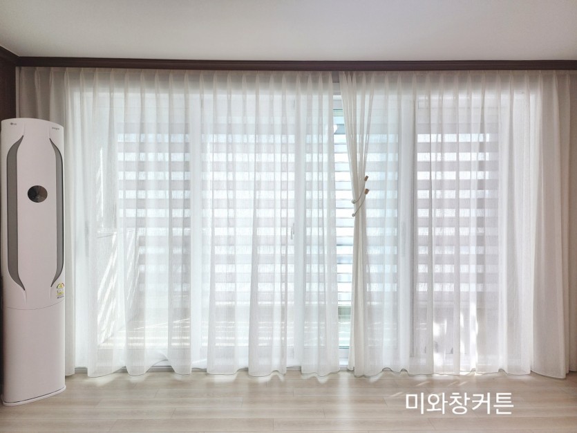 아파트 거실 아이보리 린넨룩 수입커튼 + 라이트그레이 프리미엄 콤비블라인드 시공
