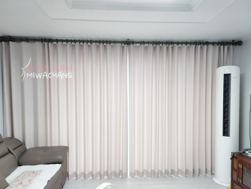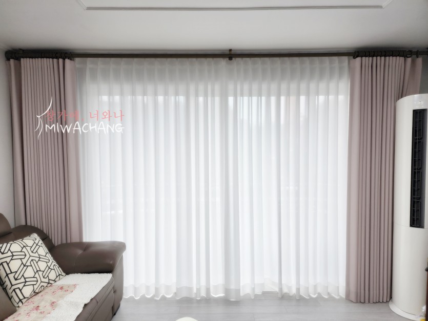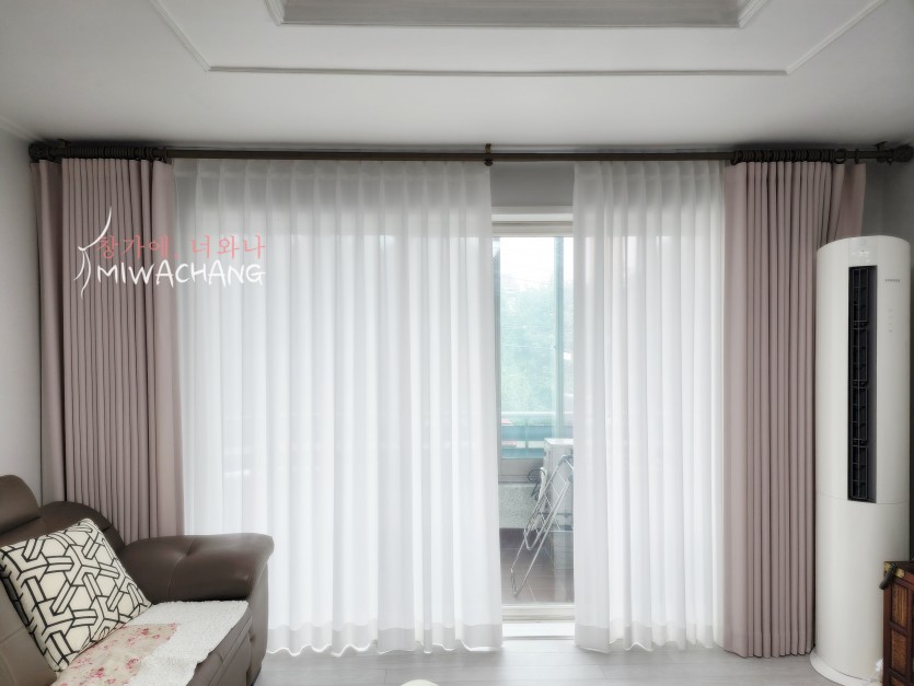 아파트 거실 핑크베이지(펄) 암막 커튼+화이트 쉬폰 커튼 시공