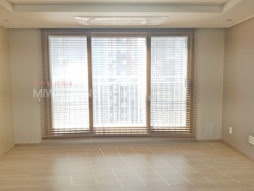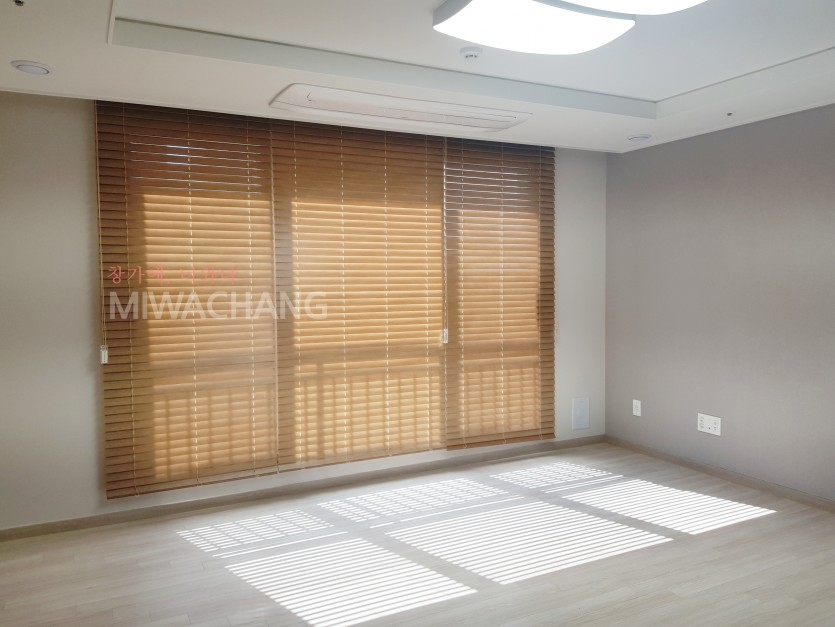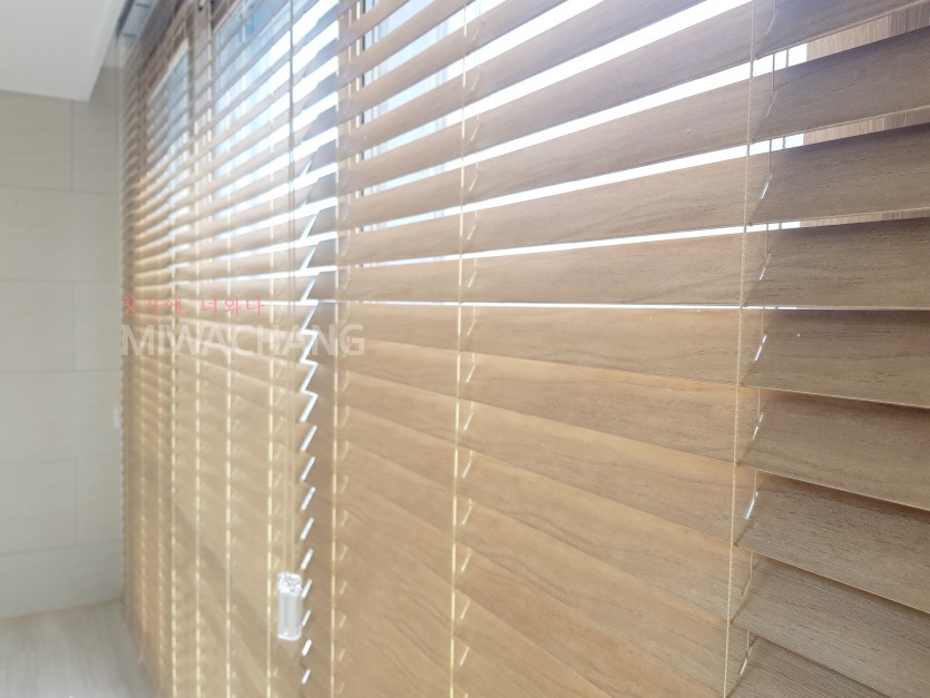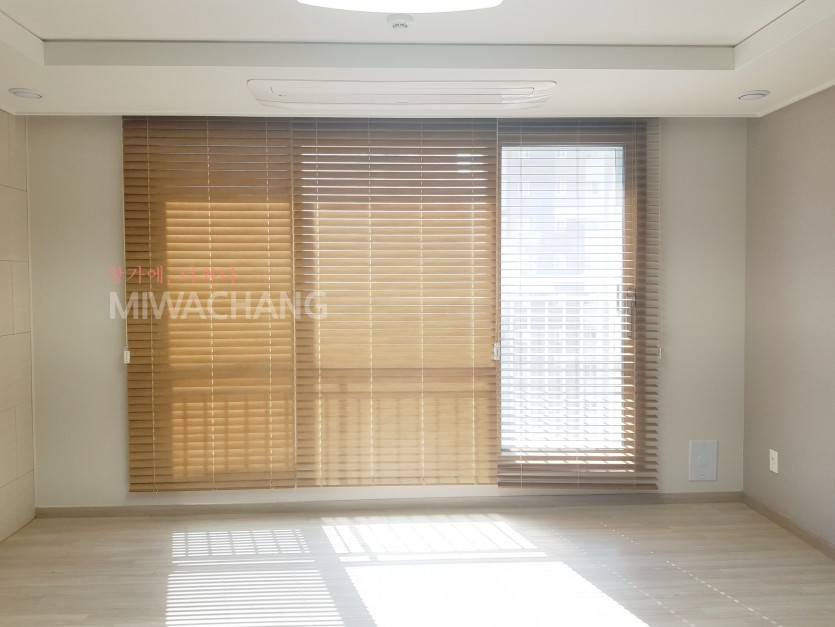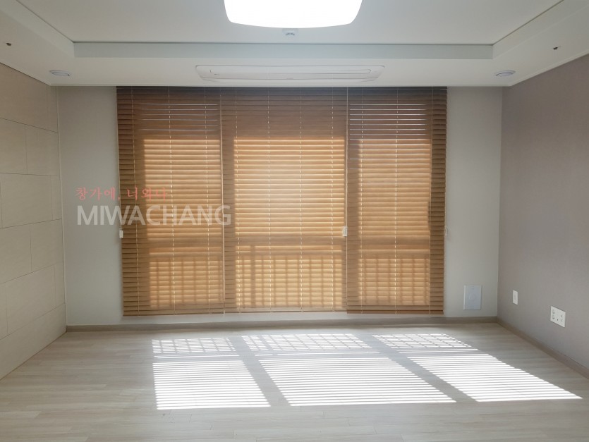 아파트 거실창 라이트브라운 우드블라인드 시공