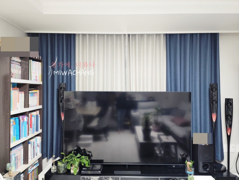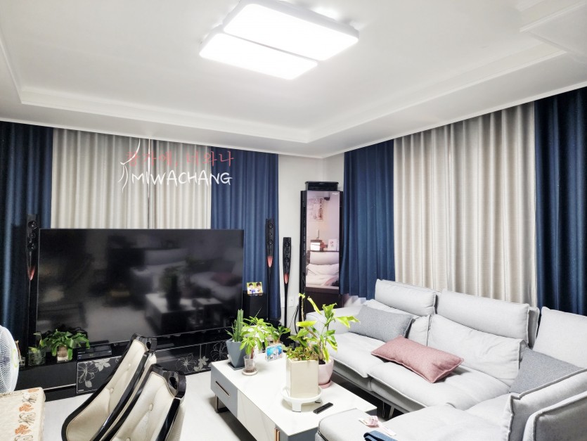 주택 거실 네이비+실버 투톤 암막커튼 시공