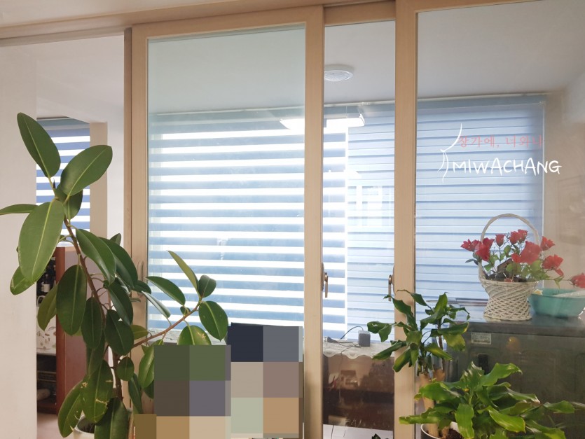 블루 색상 콤비블라인드를 앞베란다에 설치하니