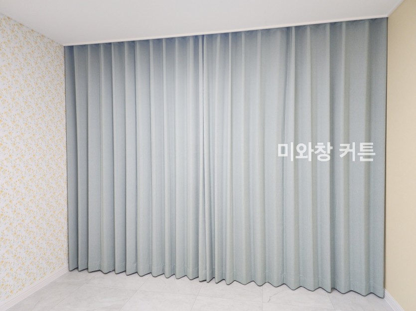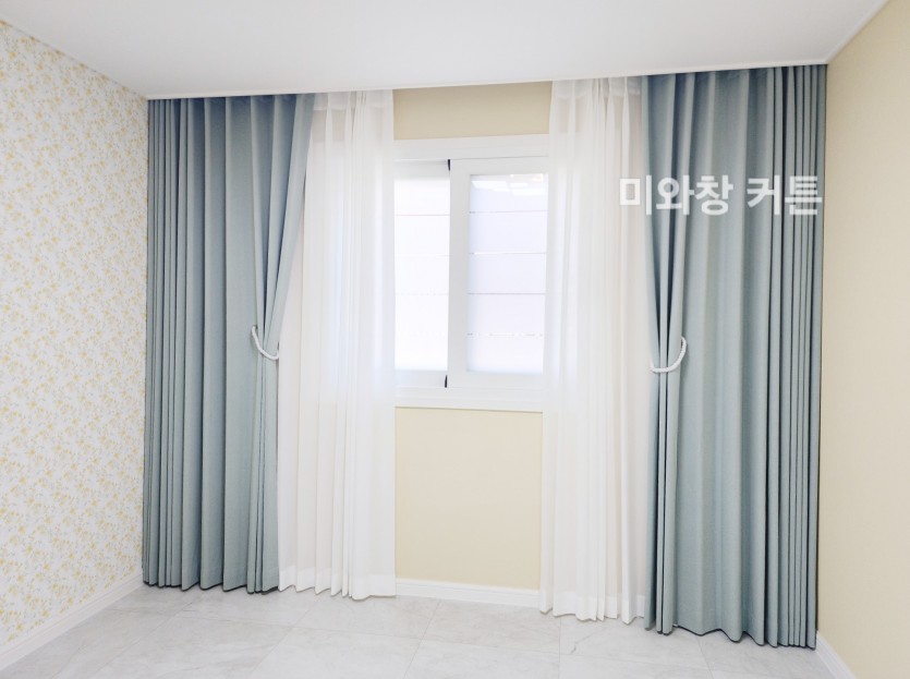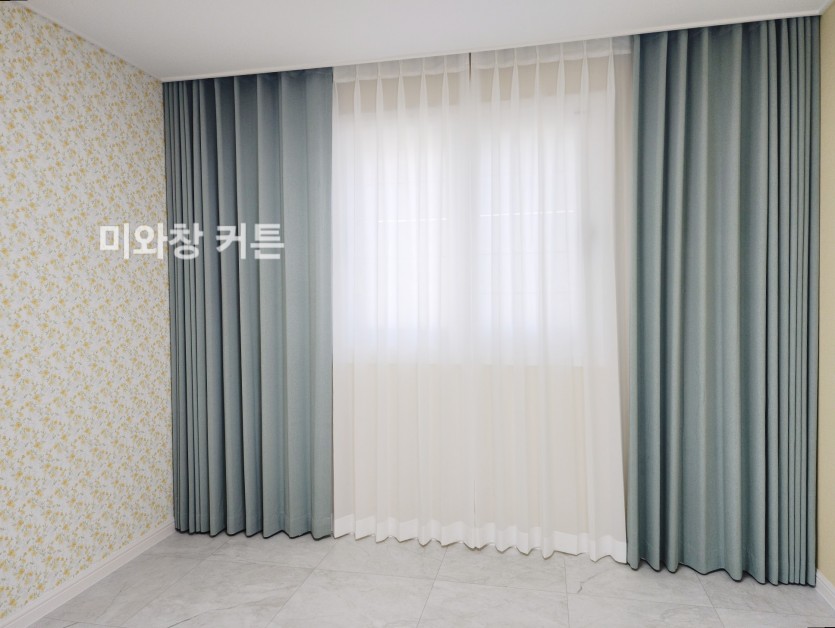 주택 작은방 민트 암막커튼 + 화이트 쉬폰커튼 시공