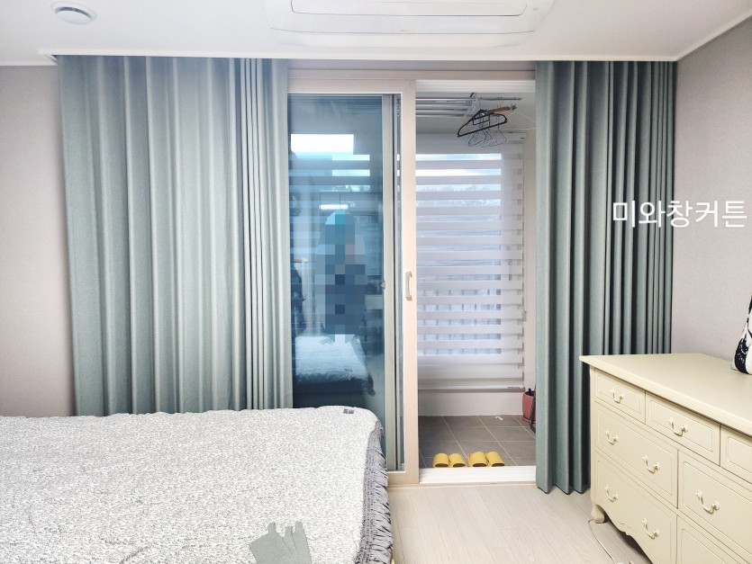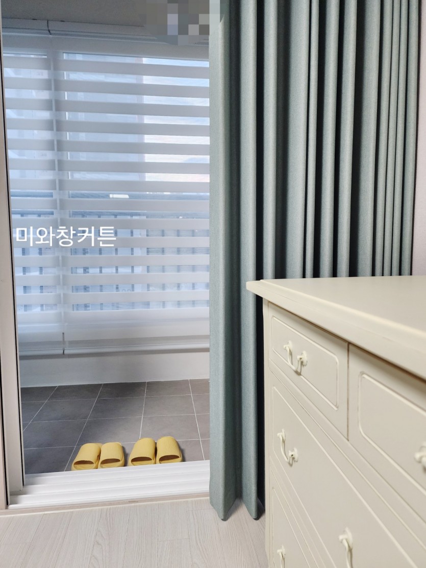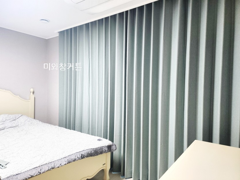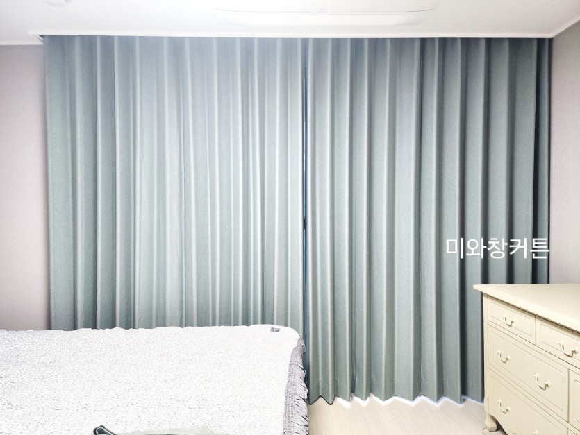 영무예다음 안방과 안방베란다 민트 암막커튼과 화이트 콤비블라인드 시공