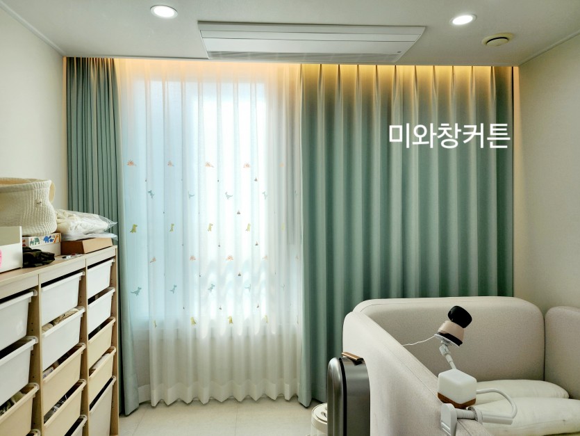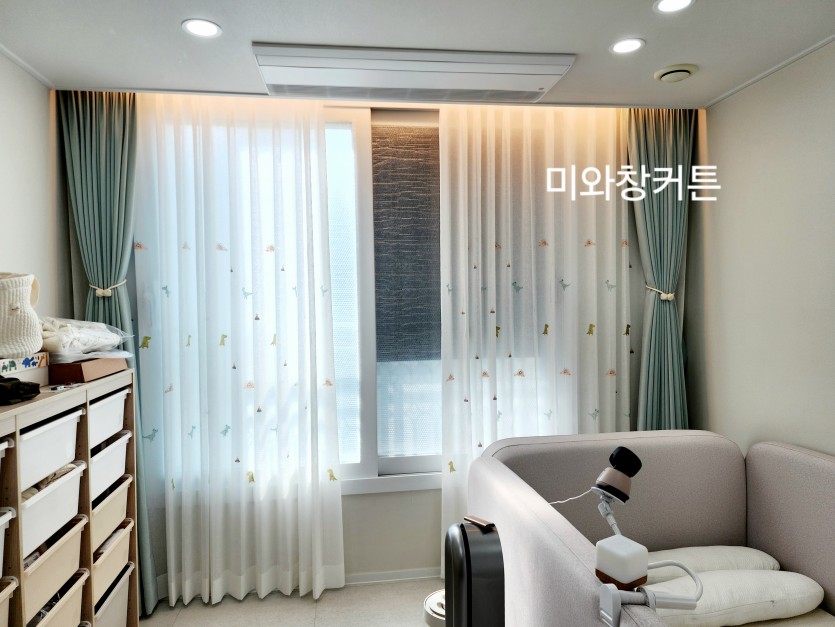 아파트 작은방 민트 암막커튼 + 공룡 자수커튼 시공
